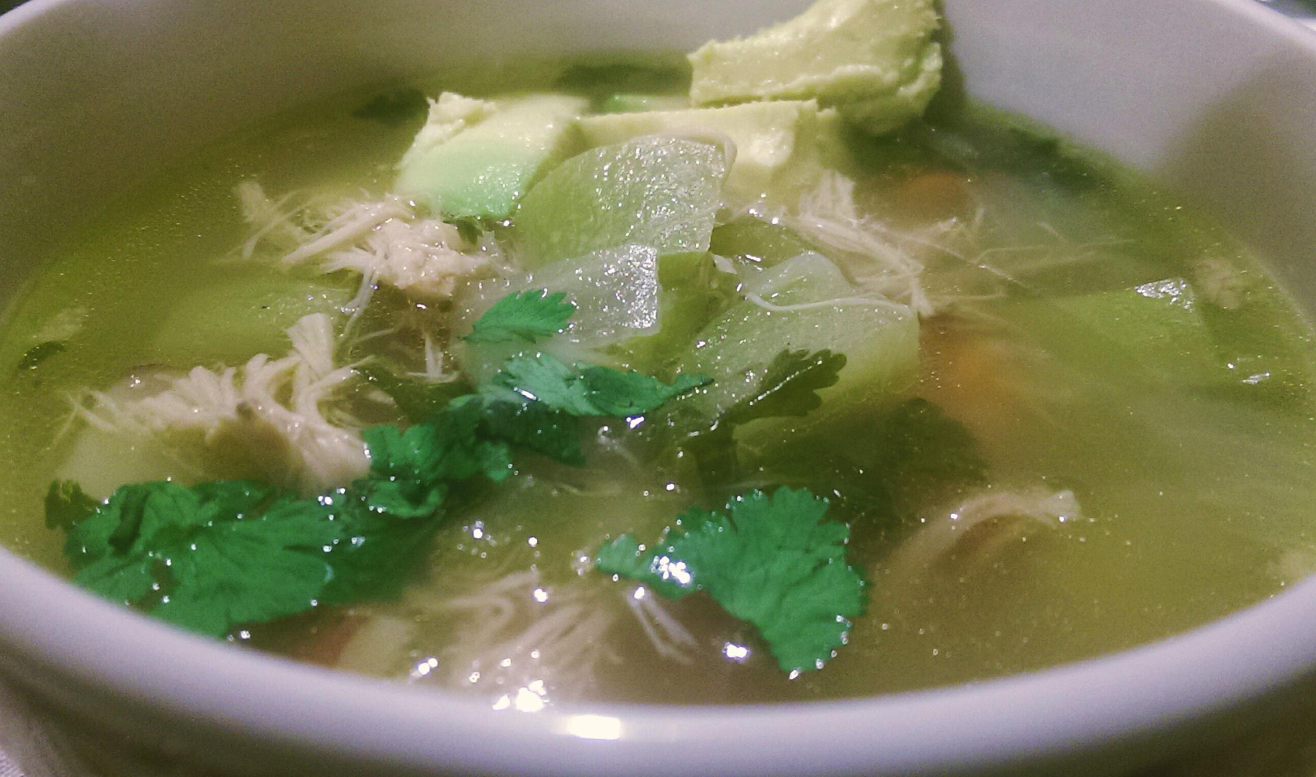 Mexican caldo de pollo (literally, “chicken stock”) is little more than a simple broth made with inexpensive and more durable dark thigh meat to which is added a few more solid components, herbs and garnishes. This version includes a Latin American native vegetable called chayote (known as mirliton in the U.S.), an apple-crisp, mild-flavored squash whose starchy flesh cooks and softens like a potato and contributes to both texture and taste.