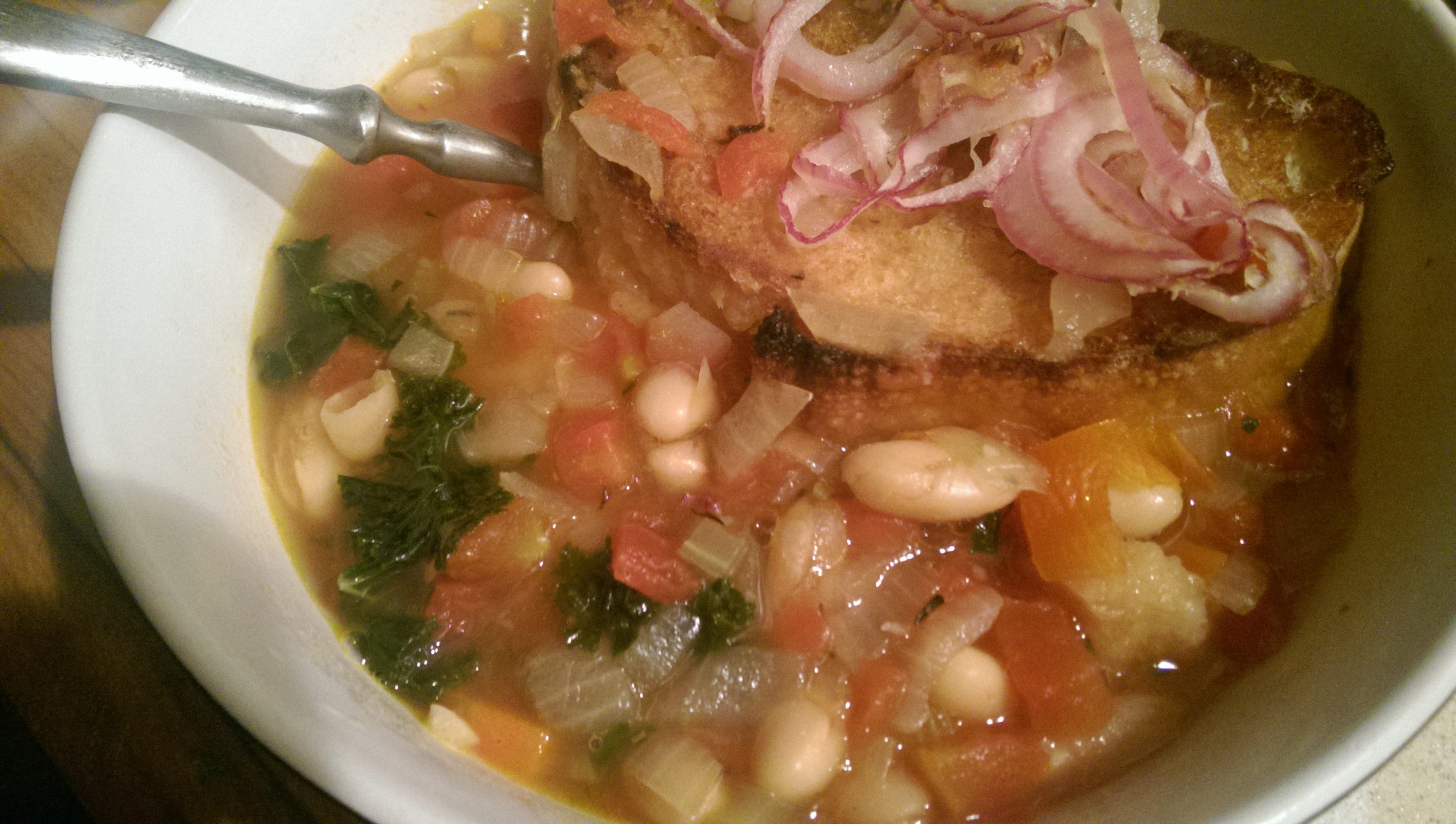 A hearty combination of vegetables and beans makes up a satisfying meatless Tuscan ribollita, served with a toasted crouton and browned onions.