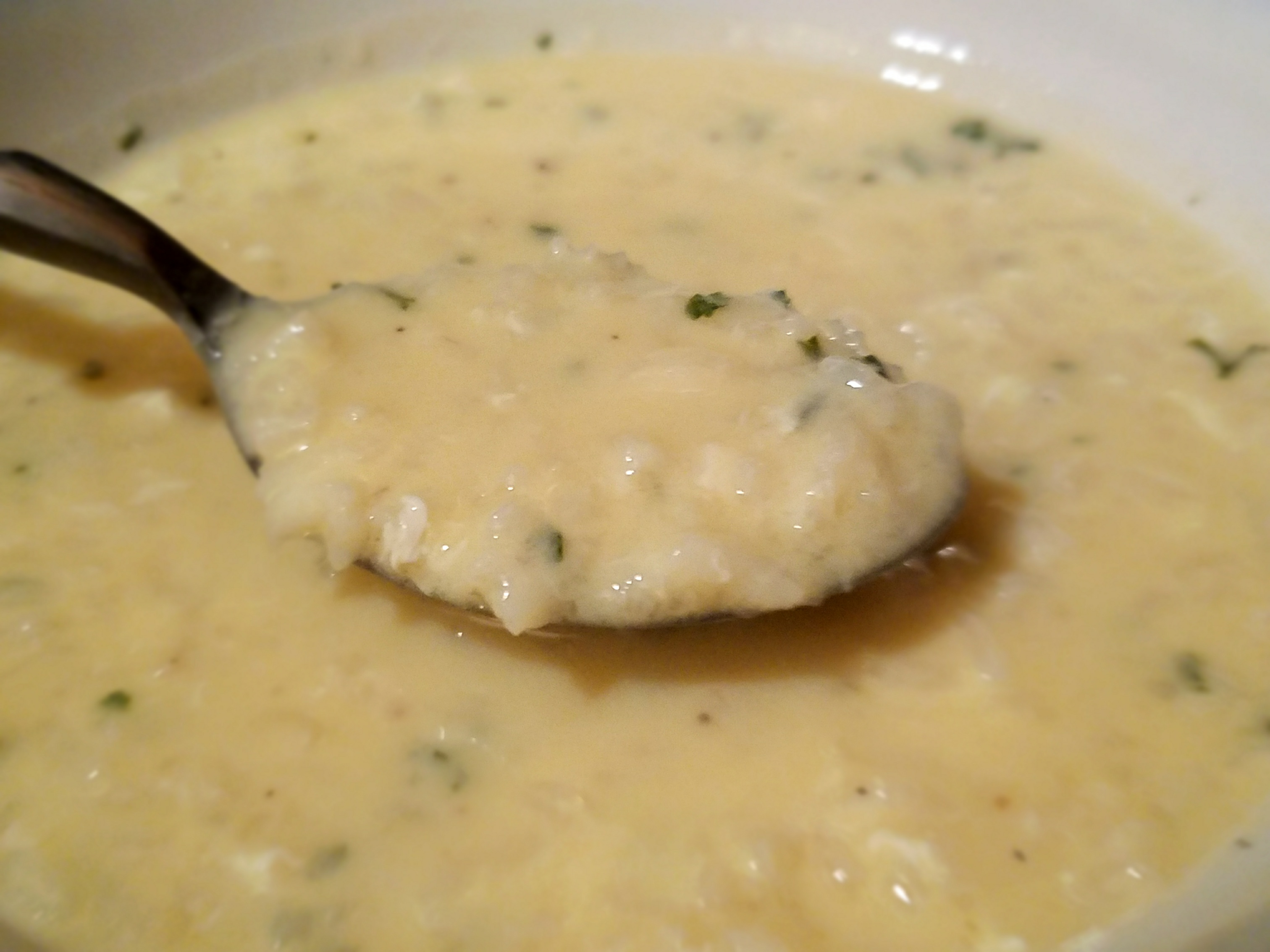 As a sauce, avgolemono is most closely associated with hollandaise, as it is thickened with beaten eggs to form a light emulsion. Because the soup has its beginnings as a sauce, its thickness can be easily adjusted by the beating of the eggs and rice and by the quantity of stock added. If you wish to serve it as a soup, be aware of overwhisking after adding the eggs else you could be well on your way to a custard.