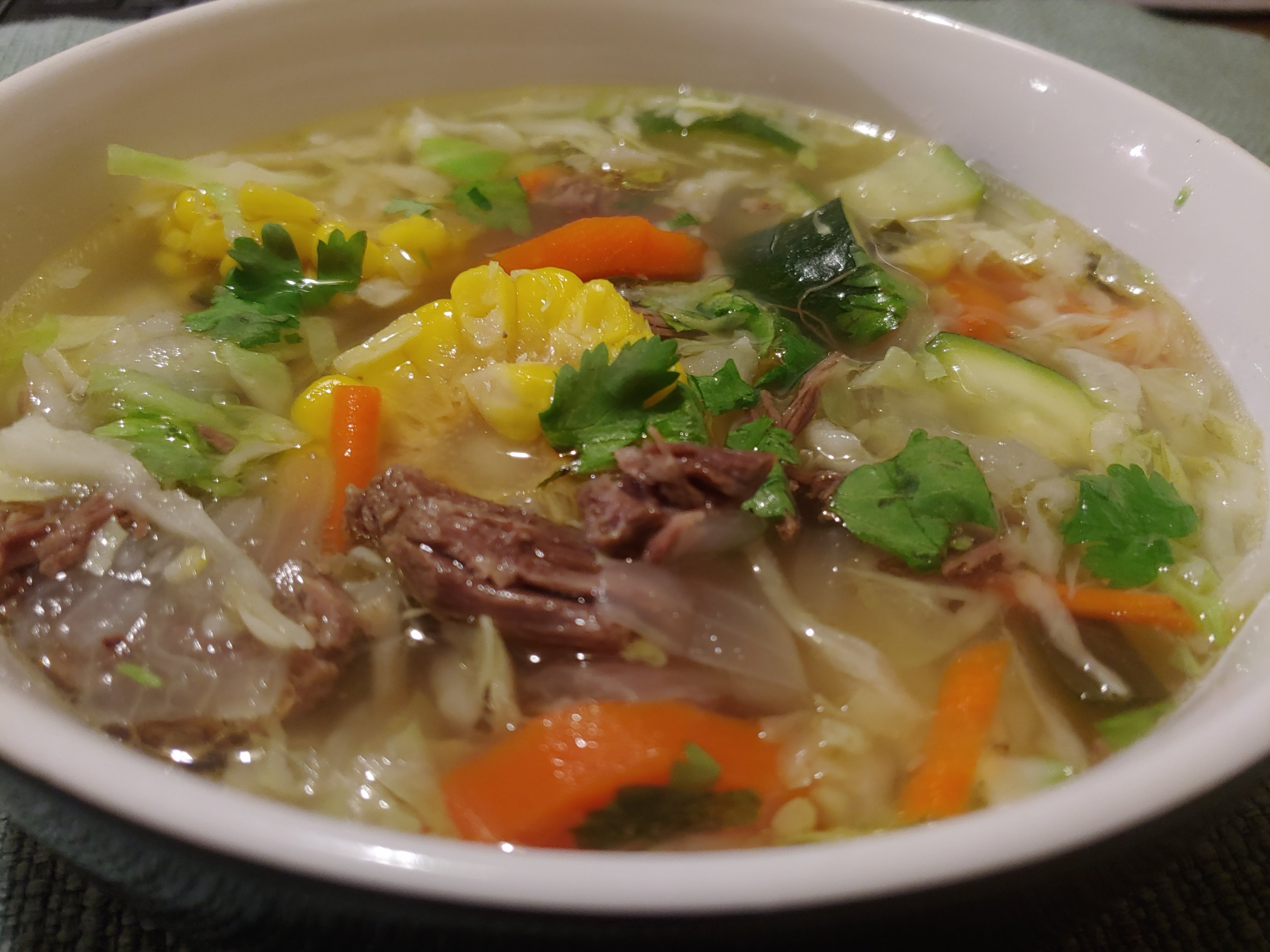 Chunks of slow-cooked beef with potato, corn and vegetables make for a traditional rustic Caldo de Res, a simply yet hardy Mexican beef soup.