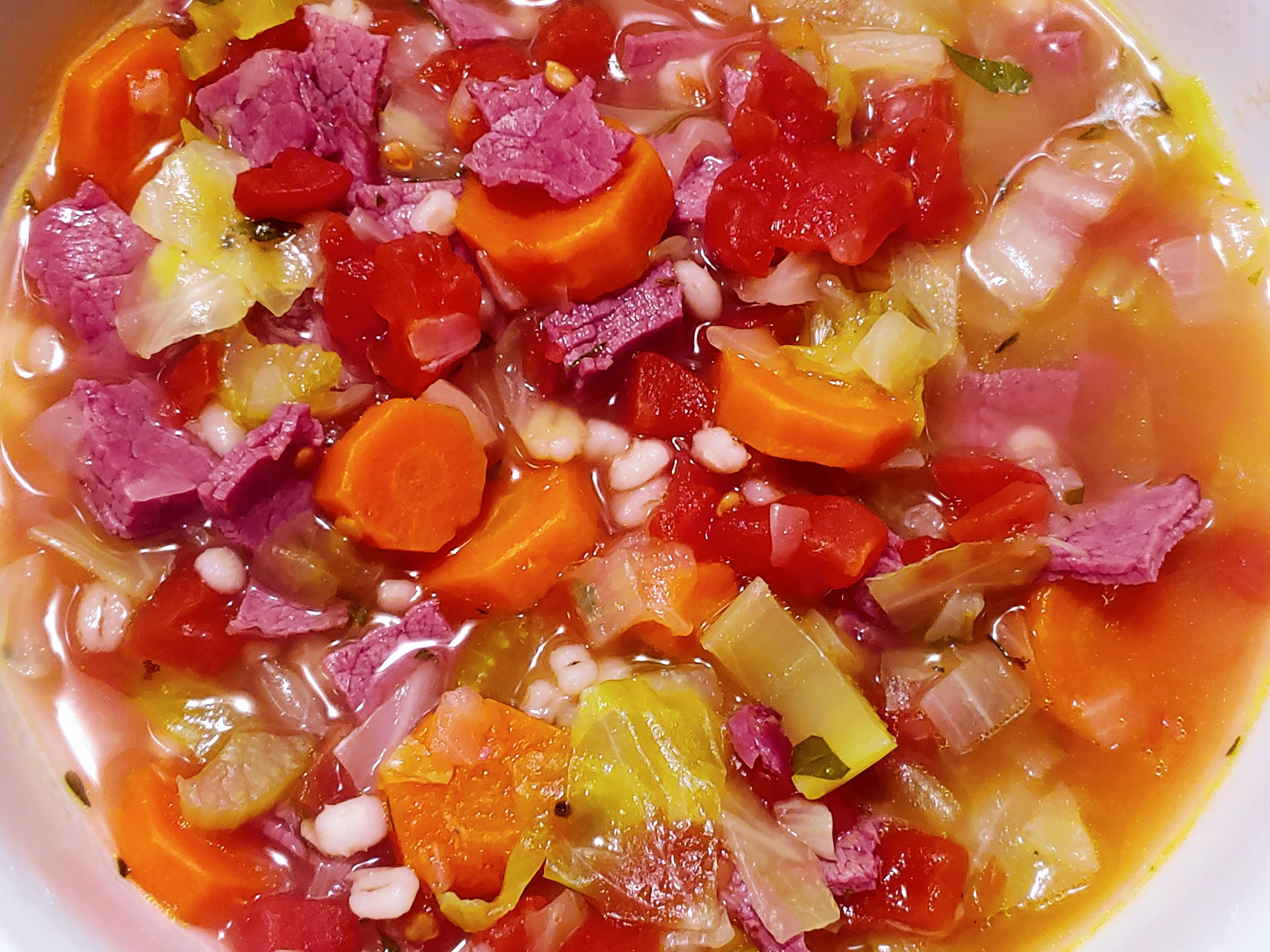 Hearty vegetables with chopped cabbage and pearled barley make this Corned Beef and Cabbage Soup a filling and satisfying mid-winter meal.