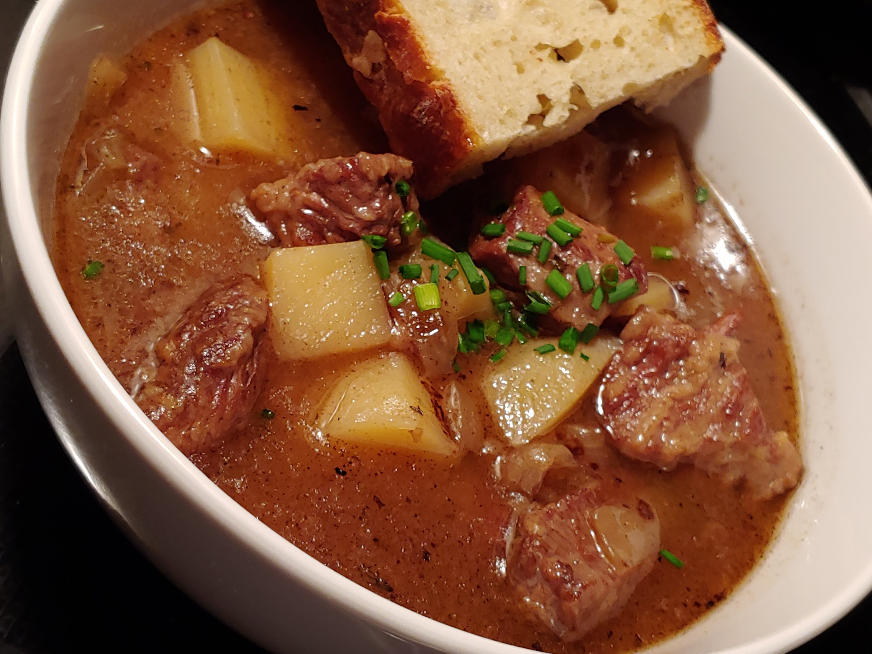 3 Add the beef, potatoes, cooked onions with liquid, broth and seasonings to a heavy pot or slow cooker. Bring to a simmer and cook over low heat, covered, for 4-6 hours or until all ingredients are tender and cooked through. Season to taste.